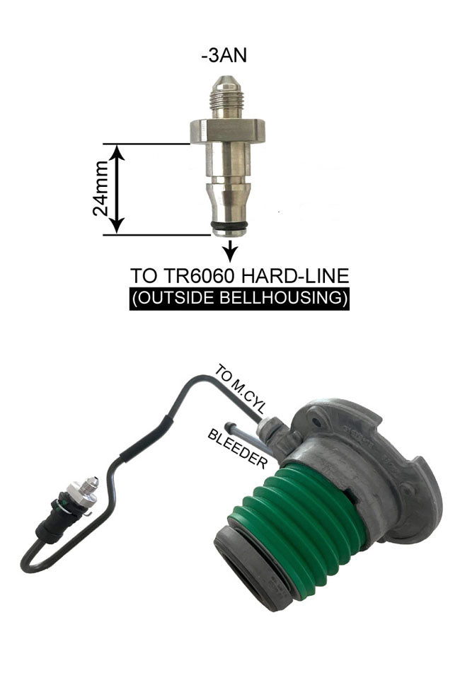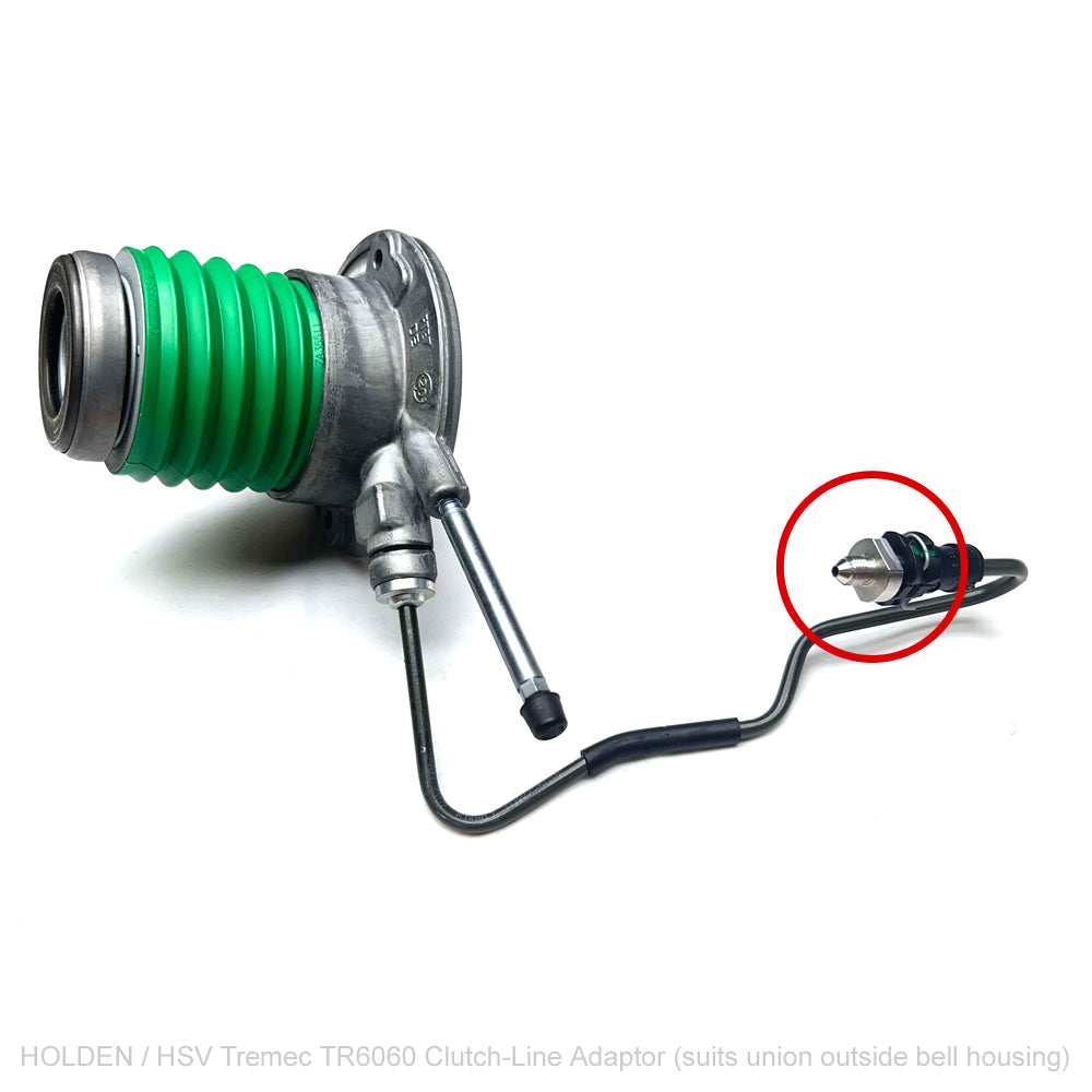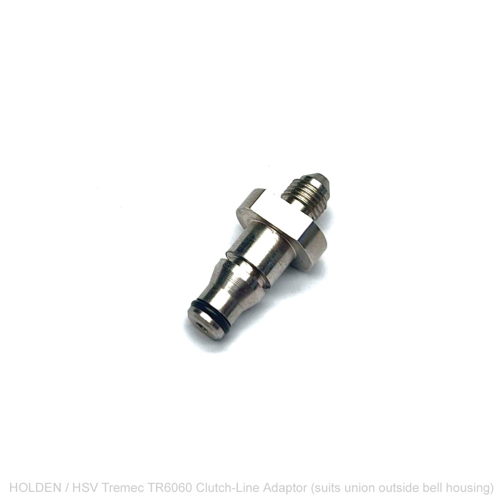 Stainless steel clutch line adaptor fitting for use with the OEM HOLDEN / HSV VE & VF Tremec TR6060 6-speed concentric slave cylinder hard-line. This fitting converts the Tremec / Holden quick-lock fitting located outside the bell housing to a more common -3AN fitting to make it easier to assemble custom clutch lines with the gearbox still installed in the vehicle. Ideal for use in TR6060 gearbox conversions and swaps that retain the HOLDEN / HSV TR6060 CSC and OEM hard-line.