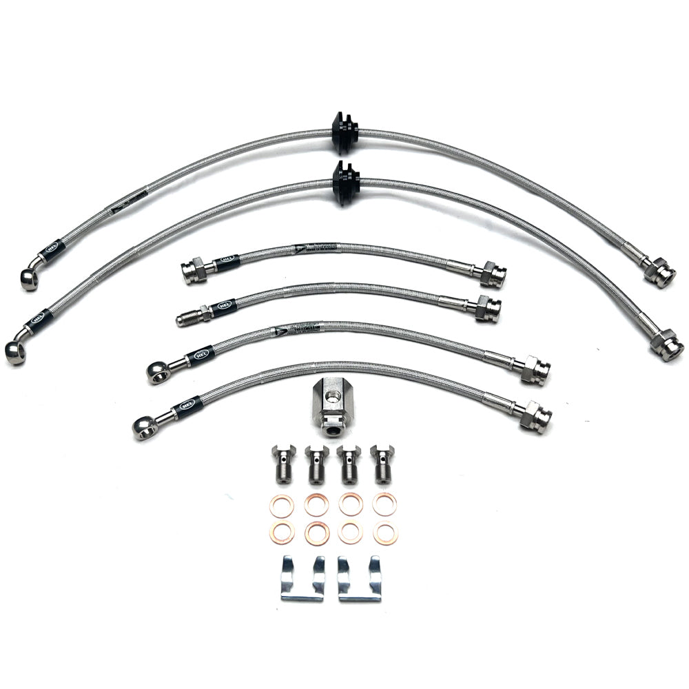 - 6-Line Braided brake line kit (2x Front, 2x Mid, 2x Rear) includes 1x stainless steel distribution block for mid-line